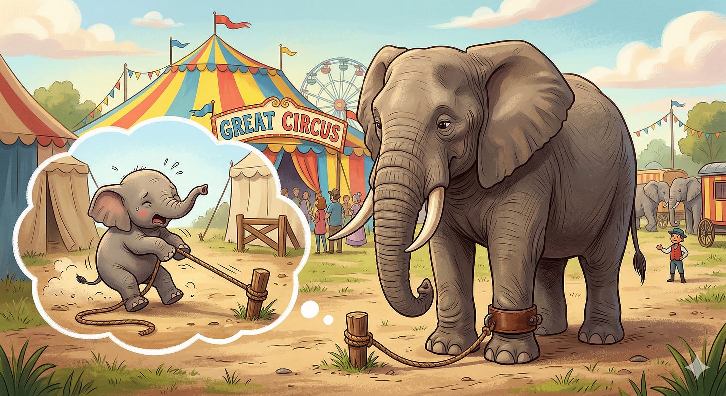Years later, that elephant is a five-ton beast that could easily uproot a tree, yet it stays tied to that same small wooden stake. Why? Because it believes it is still stuck.